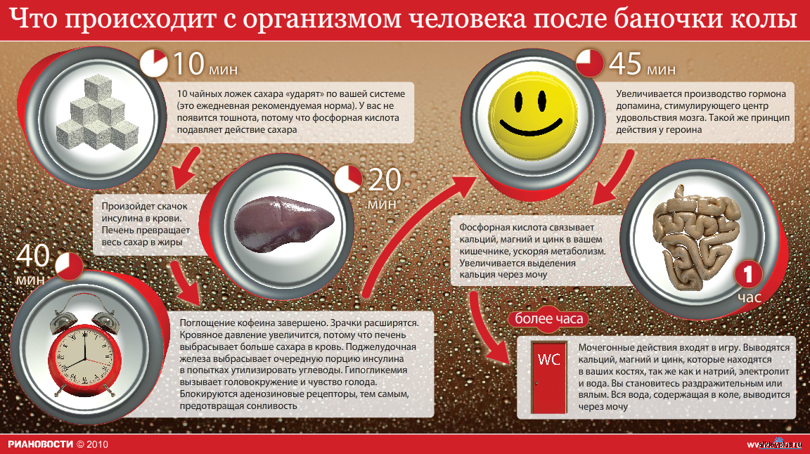 - Кроме Кока-колы естественным путём выходят электролиты и вода, необходимые человеку для полноценного функционирования органов и систем. Некогда весёлая личность становится раздражительной и апатичной, организм чувствует себя вялым из-за нехватки полезных веществ. Всё это влияние оказывает всего 1 стакан газированного напитка.