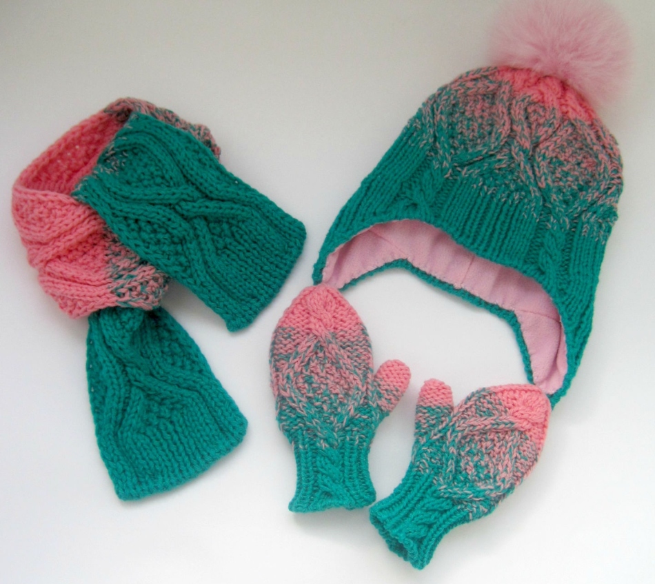 Смотрите подборку фото вязаных спицами детских теплых комплектов, состоящих из шапки, шарфа и варежек.