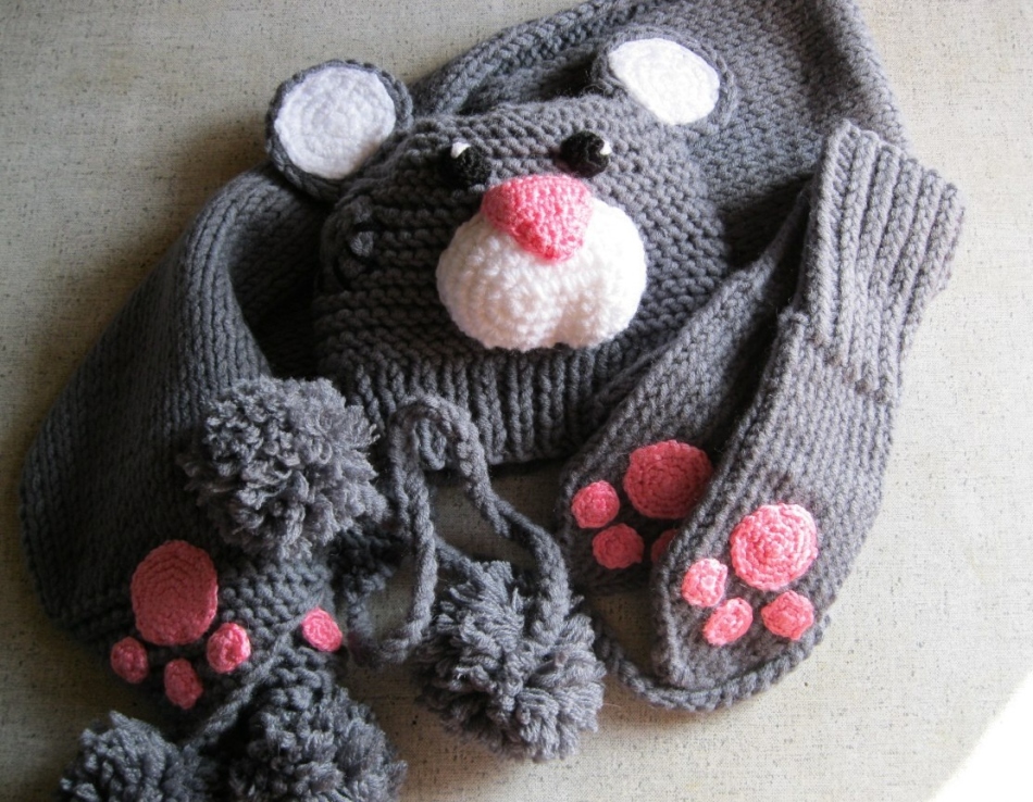 - связанными ушками, хвостами, кисточками (рукавички в виде животных, насекомых, с героями мультфильмов).