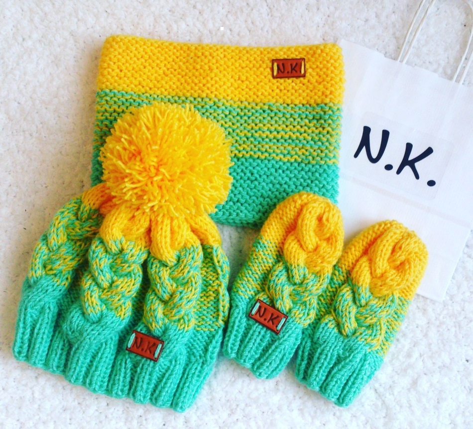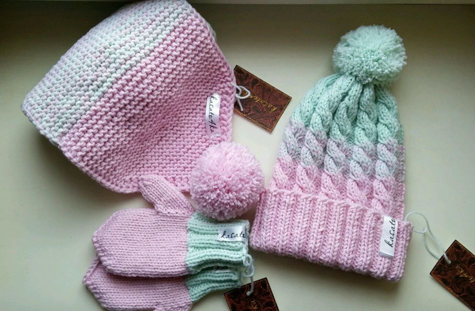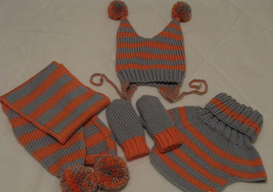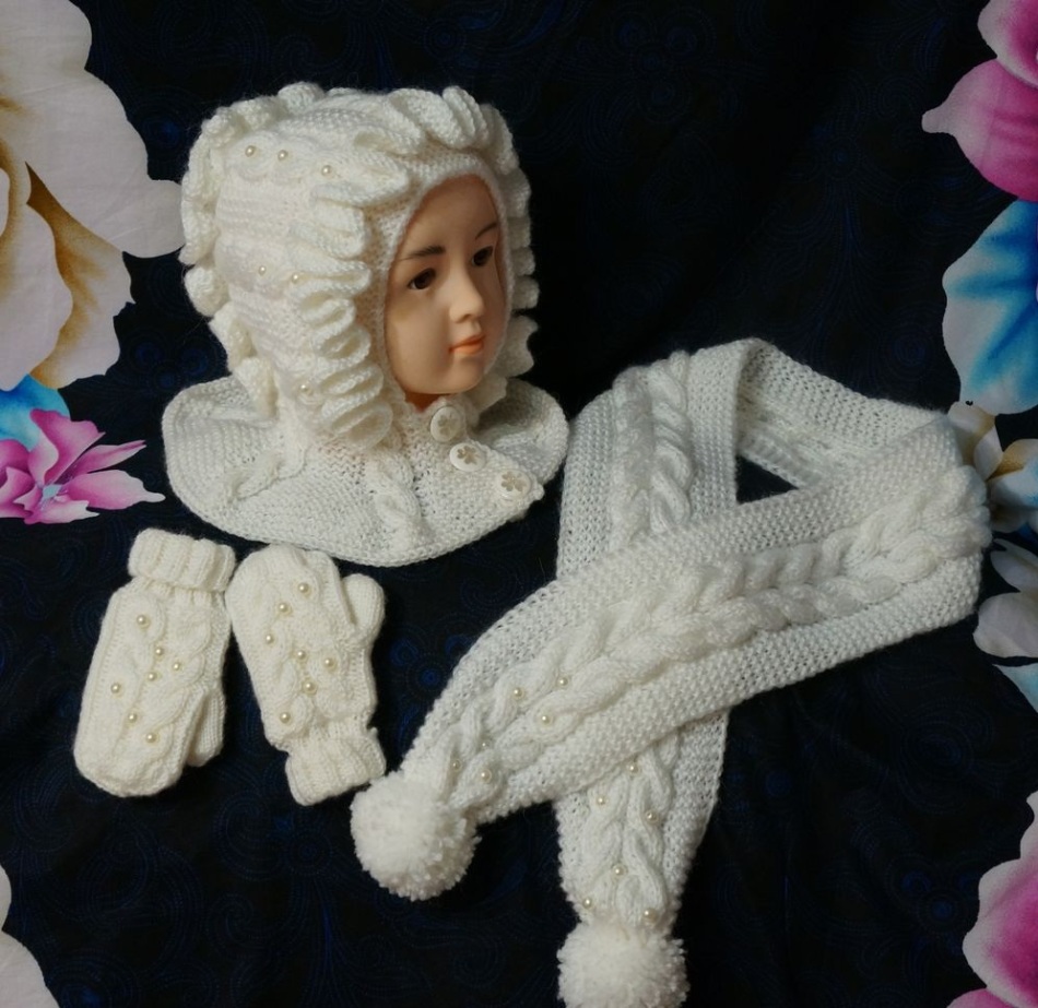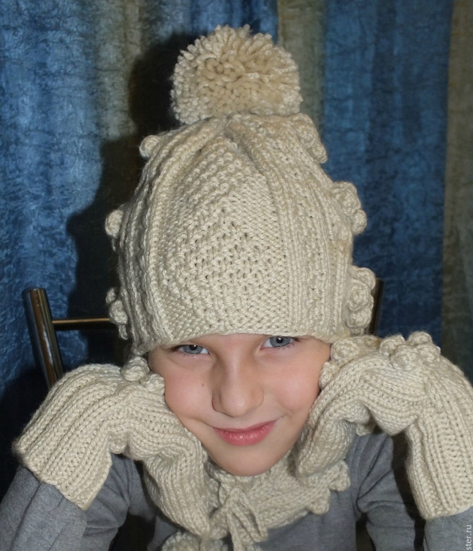 вязаный спицами комплект для ребенка — шапка, шарф, варежки, пример 1