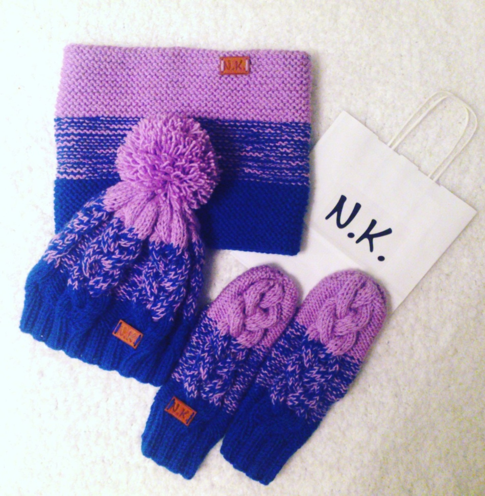 вязаный спицами комплект для ребенка — шапка, шарф, варежки, пример 3