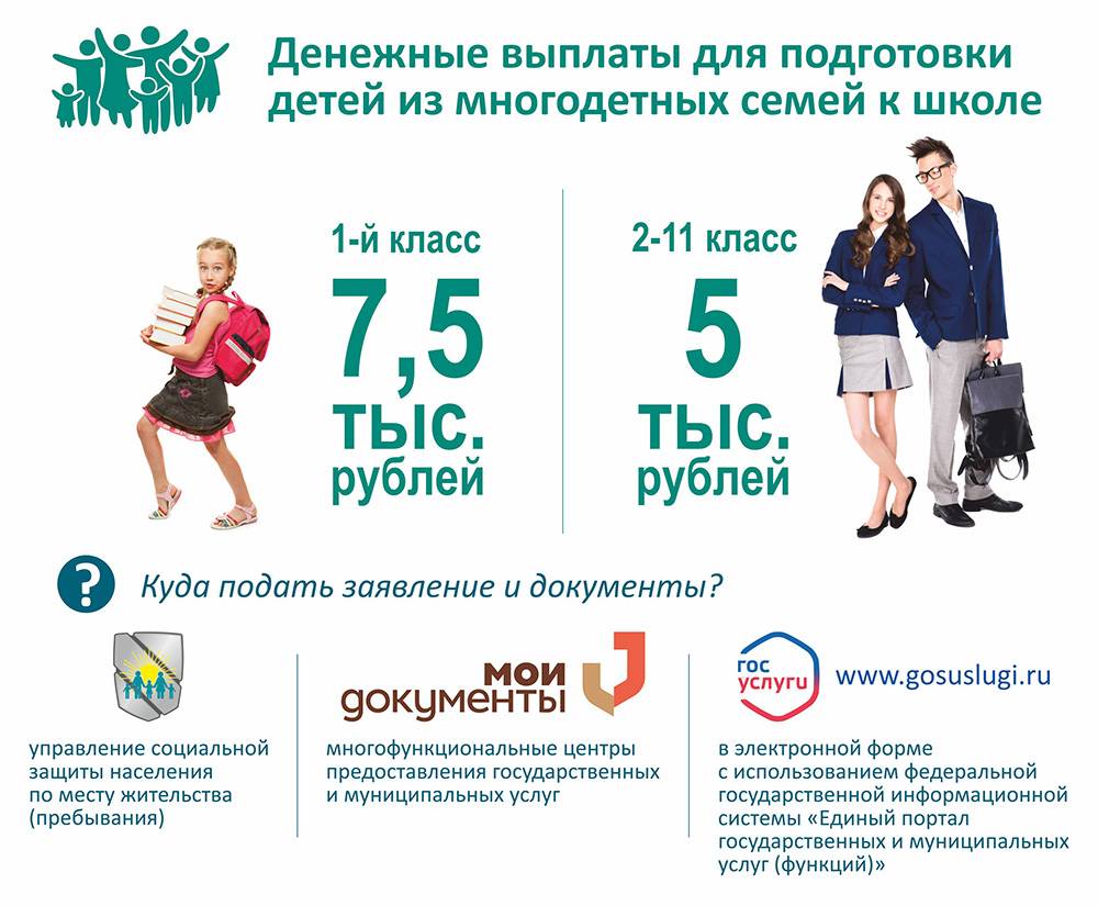 Если у многодетной семьи ребенок готовится пойти в первый класс, государство выплачивает единовременное пособие в размере 7500 рублей. По мнению Правительства РФ, этих средств должно хватить на то, чтобы подготовить будущего первоклассника к школе.