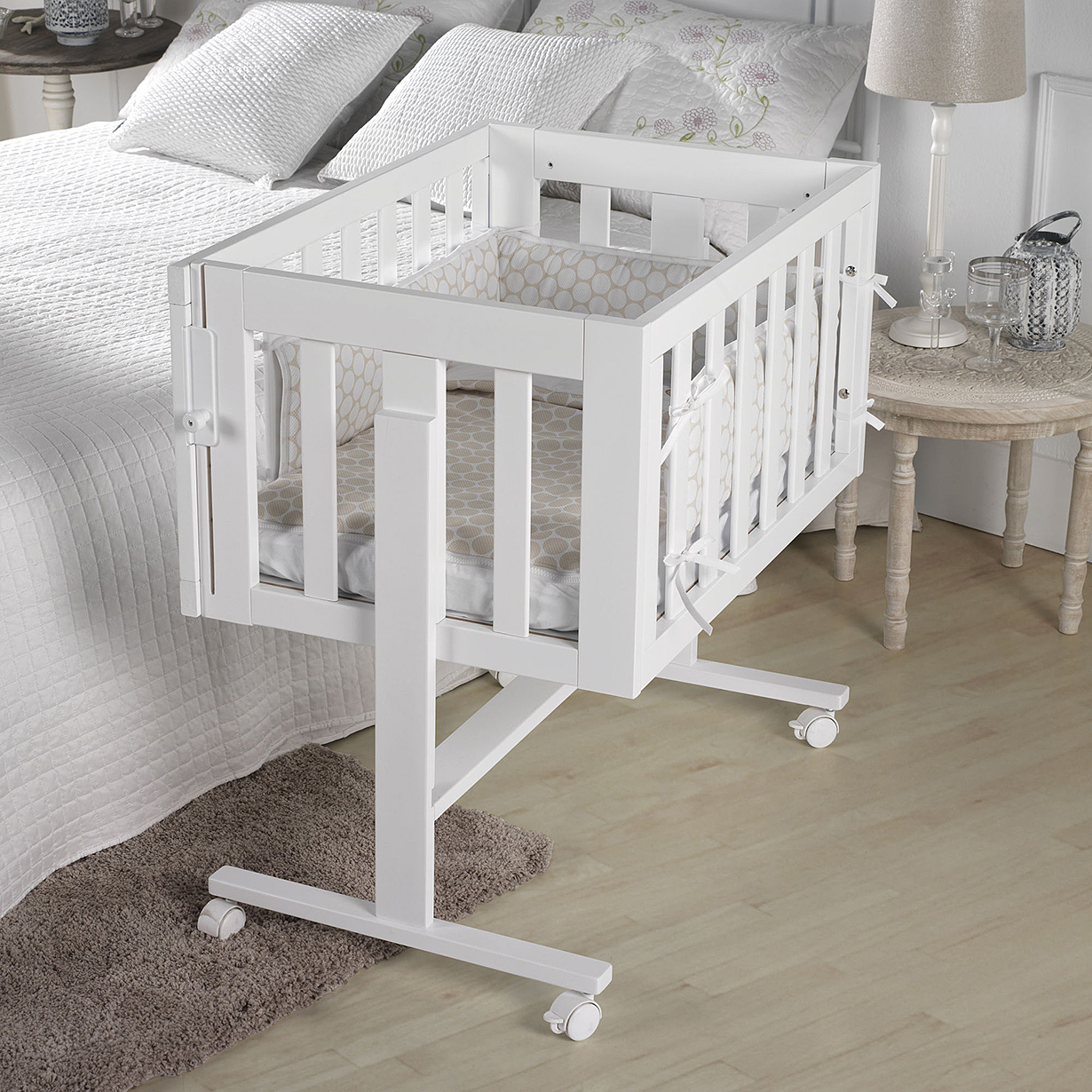 С другой стороны, если планируется позже купить для детской более сложную модель кроватки, то для родительской спальни может подойти и временный простой вариант.