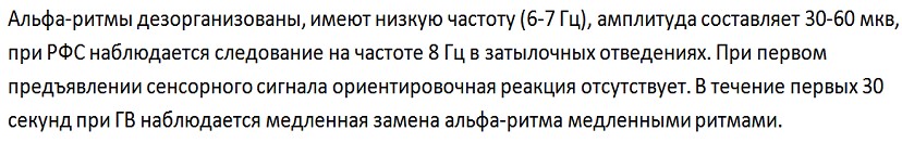 ГВ — это гипервентиляция. То есть еще один функциональный тест. Замена альфа-ритма обусловлена постепенным расслаблением сосудов, что также объяснимо с анатомической точки зрения насыщением организма кислородом, изменением кислотности крови.