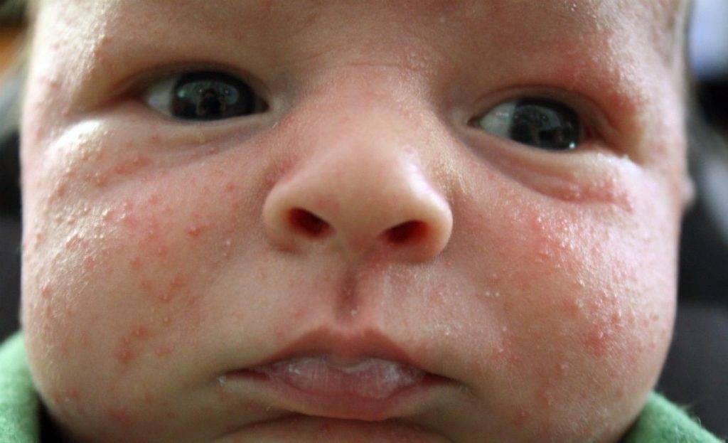 Этот недуг поражает малышей первой недели жизни. На коже головы, бёдер, ягодиц, в естественных складках появляются небольшие (до нескольких миллиметров) пузырёчки. Образовавшиеся элементы наполнены прозрачной жидкостью, но со временем она мутнеет. Тяжесть состояния крохи зависит от количества высыпаний, но в целом течение недуга благоприятное.